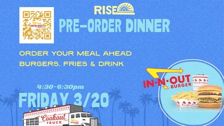 On Friday night March 20 the In-N-Out Burger Food Truck will be here for our RISE Women's Conference! They will be here from 4:30pm to 6:30pm.